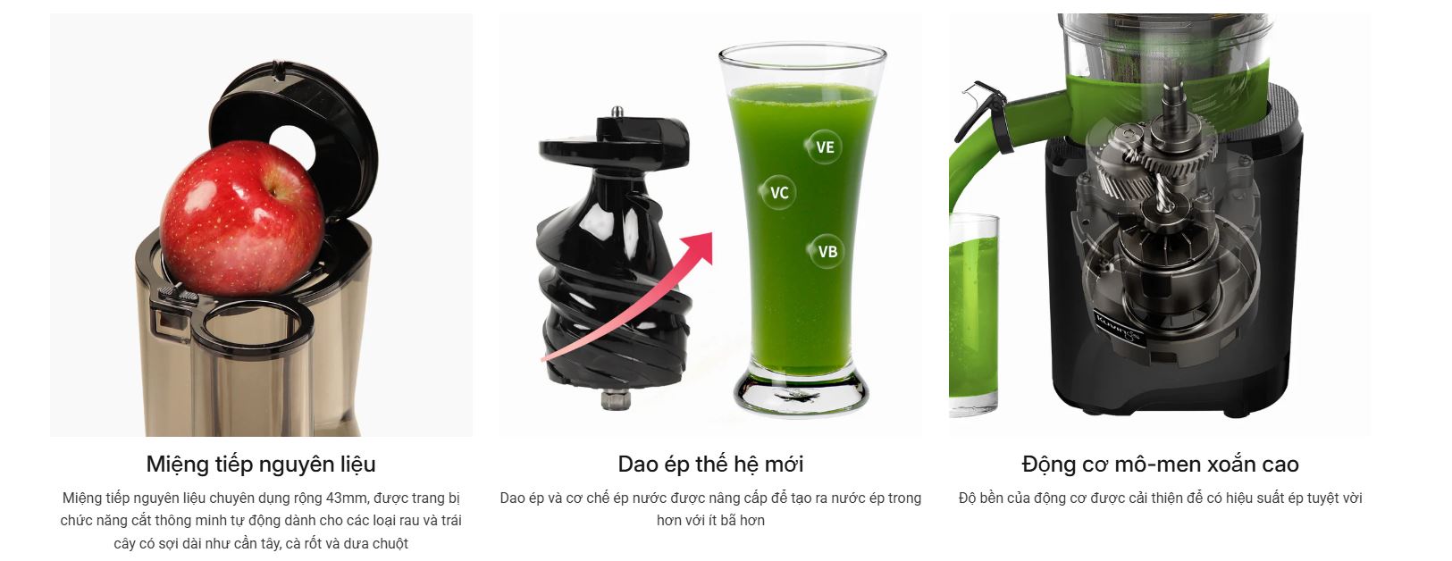 Kích thước nâng cấp của toàn bộ quả táo to hơn, dễ dàng hơn. Miệng ép nguyên trái cực rộng có thể chứa toàn bộ nguyên liệu, giảm thời gian chuẩn bị.