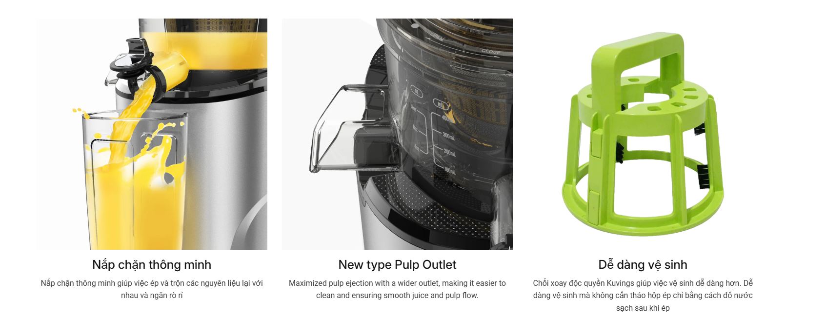 Cổng tiếp nguyên liệu 90mm dành cho trái cây nguyên quả và ống cắt tự động 43mm dành cho rau lá, cà rốt được kết hợp tạo nên thiết kế hoàn toàn mới cho máy ép Kuvings.